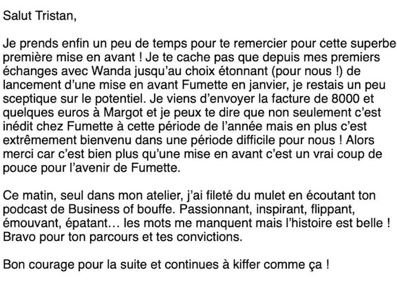Oui, 8 000 euros, c'est le chiffre d'affaires généré par une jolie petite entreprise française de poissons fumés... via le Club Pépites (qui ne prend jamais de commissions !). Et encore, ce n’est pas le max : à Noël, le Club Pépites a permis de faire gagner près de 70 000 euros en une poignée de jours à une autre jolie entreprise française. Si vous lisez attentivement Pomélo, vous avez déjà entendu parler de Pépites (ex-Moi Chef) qui propose à 1 000 membres max des ventes privées de produits d'artisans, ceux qui fournissent les plus grandes tables de France. Avec un tarif pro même si on parle de particuliers. Et l'équipe de Pépites privatise aussi en avant-première les restaurants pas encore ouverts. Il reste encore quelques places pour rejoindre ce club pas comme les autres, je vous recommande vraiment de cliquer sur cette URL avant que ce ne soit trop tard.